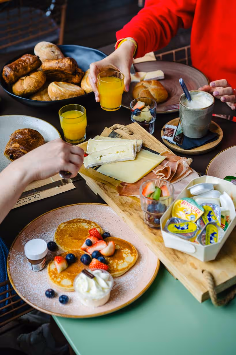 Je krijgt een croissant, broodjes, confituur, choco, boter, Parijse ham, Italiaanse ham, jonge kaas en Franse brie, glaasje fruitsla.Je kan genieten van een heerlijk Cappuccino meets Rooftop bord met toast avocado en roerei, een spiegelei met spek, worstje en pannenkoekje met fruit.